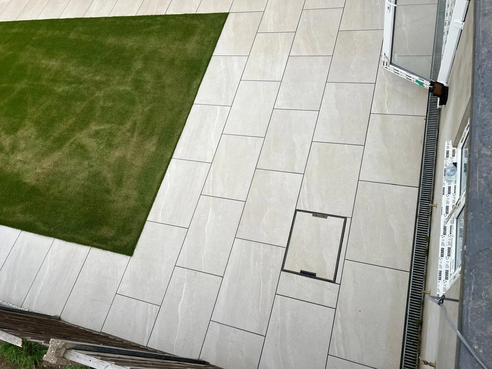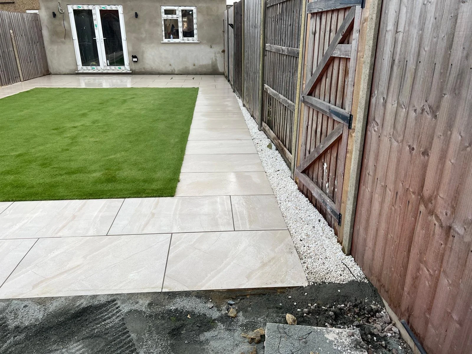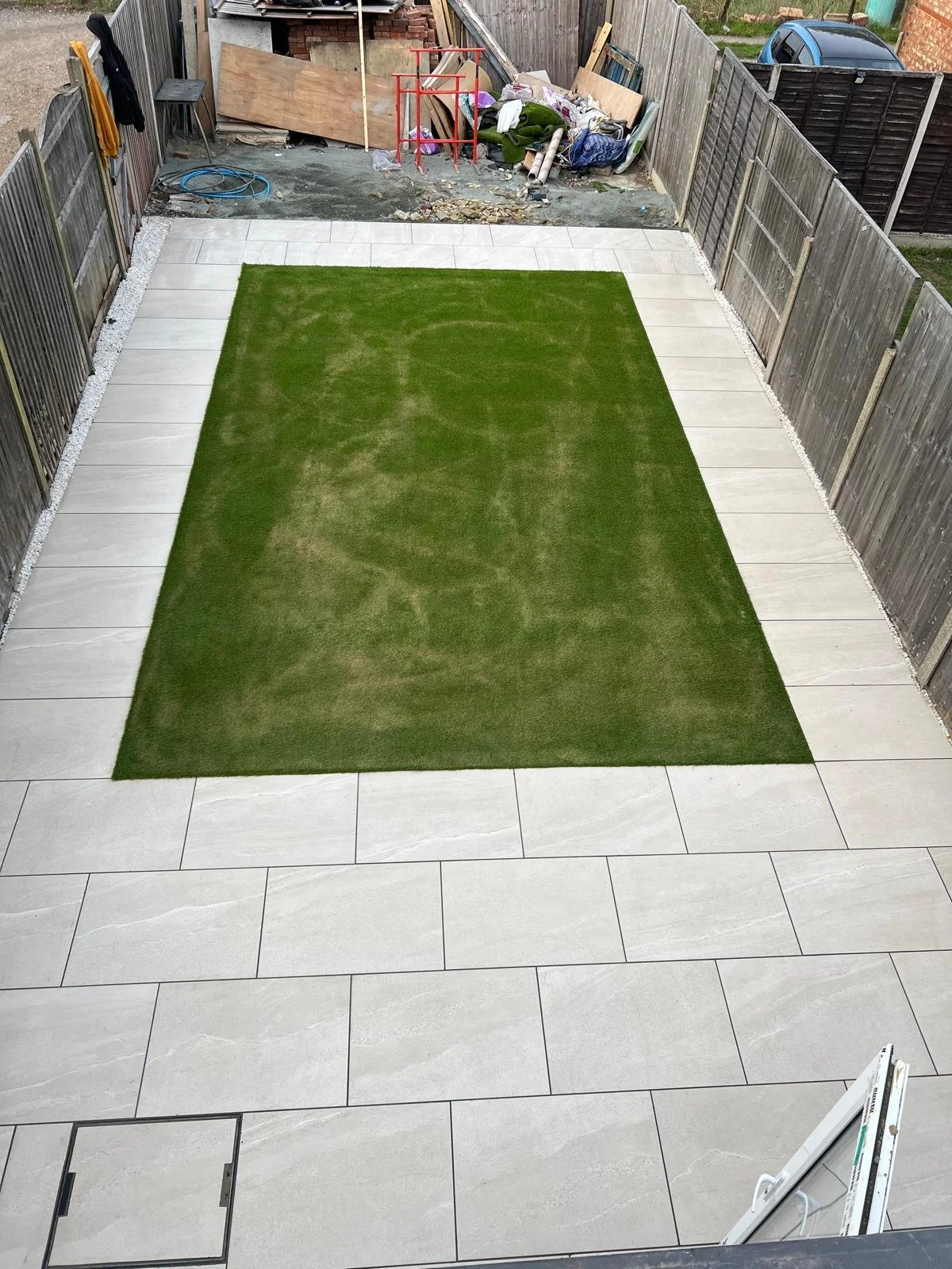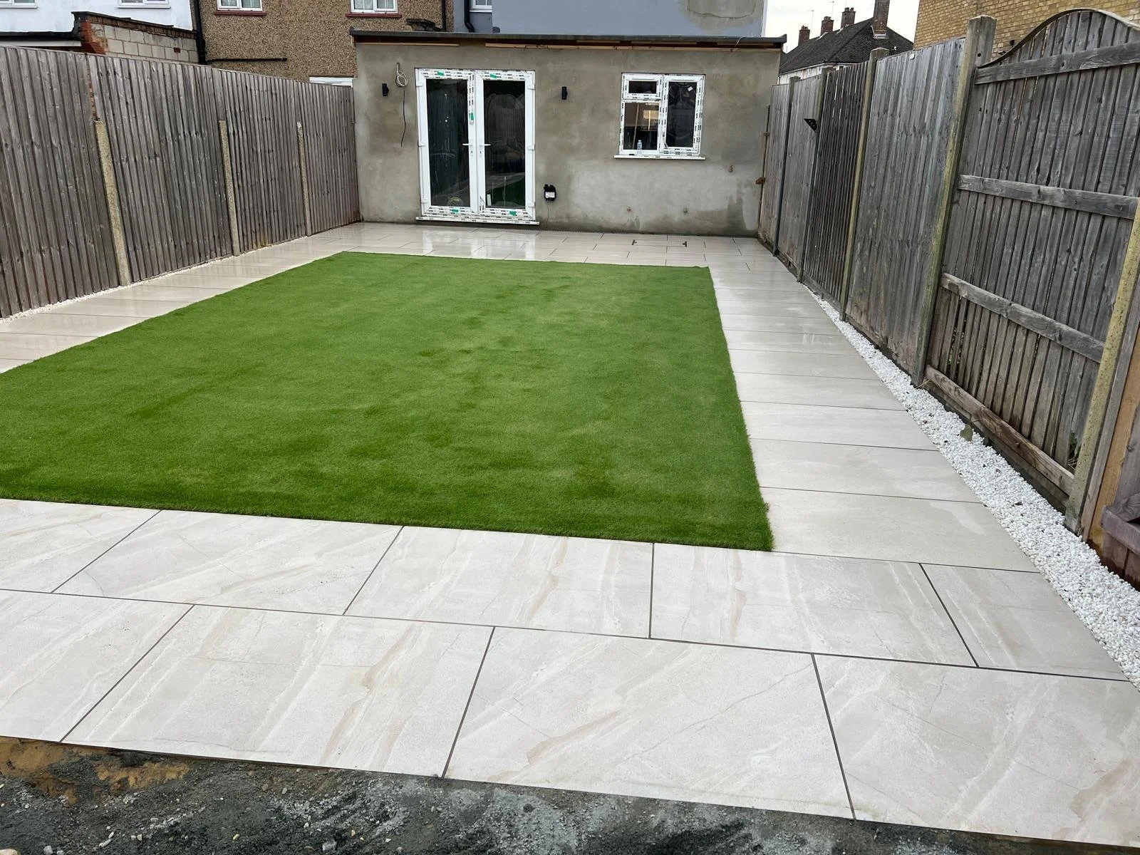 Full garden transformation completed in Enfield — including porcelain tile paving, artificial grass installation and a new recessed manhole cover for a seamless finish.
